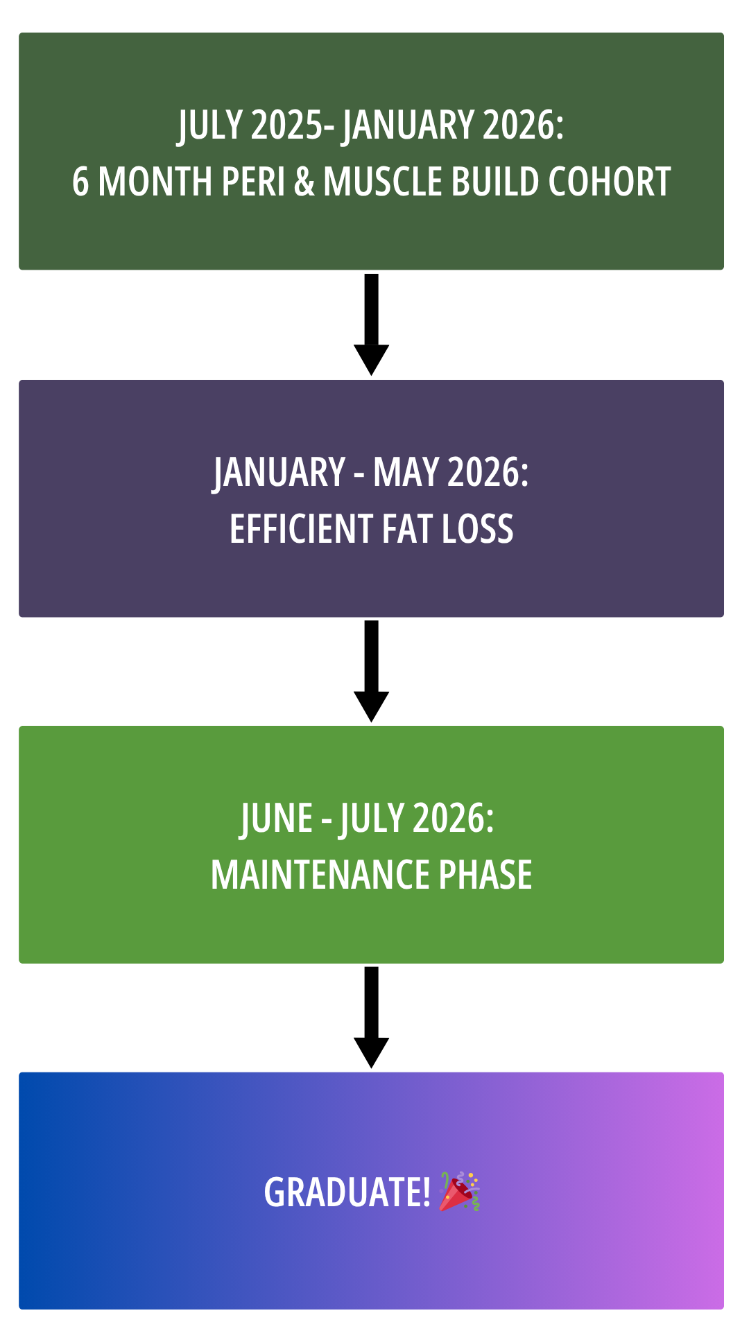 After completing the 6-month menopuase & muscle-building cohort, you’ll have the option to roll into an efficient fat-loss phase, followed by a brief maintenance reset—solidifying your knowledge and giving you a complete cycle of periodization under your belt.
